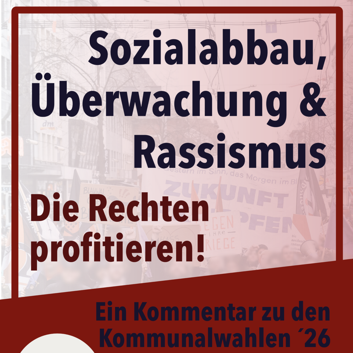 Kommunalwahl in Bayern: Sozialabbau, Überwachung & Rassismus KommentarMünchen Antifa-Stammtisch München|23.02.26 Am 8. März 2026 finden in Bayern – und damit auch in München – Kommunalwahlen statt. Hier werden Bürgermeister:innen und Stadtrat gewählt. Diese Entscheidungsträger:innen beeinflussen die Verwaltung unserer Stadt – von Wohnraum über Bildung, soziale und gesundheitliche Versorgung bis hin zu öffentlichen Sicherheit, Infrastruktur und Kulturangeboten. In ihrer Wahlpropaganda versprechen alle Parteien für uns – die Stadtbevölkerung und Arbeitnehmer:innen – Verbesserungen. Aber ihre Taten zeigen anderes: immer härtere Sparmaßnahmen auf unserem Rücken. Die Auswirkungen sind schon jetzt massiv: München ist unbezahlbar – Wohnraum und Freizeitgestaltung sind Luxusgüter. Bildung und gesundheitliche Versorgung sind oft an den Geldbeutel geknüpft. Soziale Hilfen gibt es wenig, und wenn, dann nur mit ewig langer Wartezeit […]