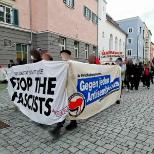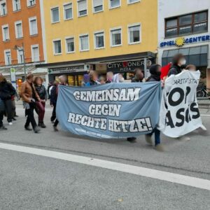 In einem weiteren Redebeitrag zeigten wir, dass es sich bei der AfD keineswegs um eine „soziale“ Partei handelt. Die AfD ist im Kern rassistisch, sexistisch sowie neoliberal und damit eine Partei fürs Kapital! Als wir uns dann lautstark auf den Weg durch die Rosenheimer Innenstadt machten, erfuhren wir zahlreiche positive Reaktionen der Pasant*innen. Einige schlossen sich sogar spontan unserem Protest an. Angekommen an der Kundgebung der AfD-ler Rassist*innen versuchten wir diese lautstark, unter anderem durch Trillerpfeifen sowie lautstarke Parolen, zu stören.