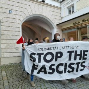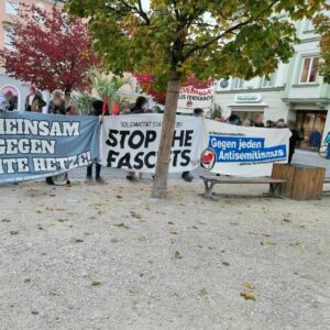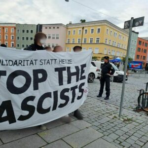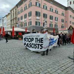 Positiv an vergangenem Freitag bewerten wir, dass wir den Faschos der AfD zahlenmäßig überlegen waren, auch die zahlreichen postiven Reakionen der Pasant*innen bewerten wir als Erfolg. Dies täuscht aber nicht darüber hinweg, dass es unser Ziel als Antifaschist*innen sein muss, Kundgebungen der AfD erntshaft zu stören und im besten Fall zu verhindern. Dies ist uns leider vergangen Freitag nicht annähernd gelungen! Gerade im Hinblick auf den Versuch eines „heißen Herbsts“ von Rechts sowie dem allgemeinen, globalen Rechtsrutsch müssen wir als antifaschistische Bewegung überlegen und darüber diskutieren, wie wir diesem entgegentreten können! Wir halten es für unerlässlich den Faschos den Nährboden zu entziehen und Alternativen jenseits von Rassismus, Hass und Hetze aufzuzeigen!