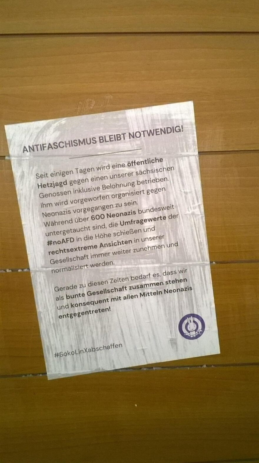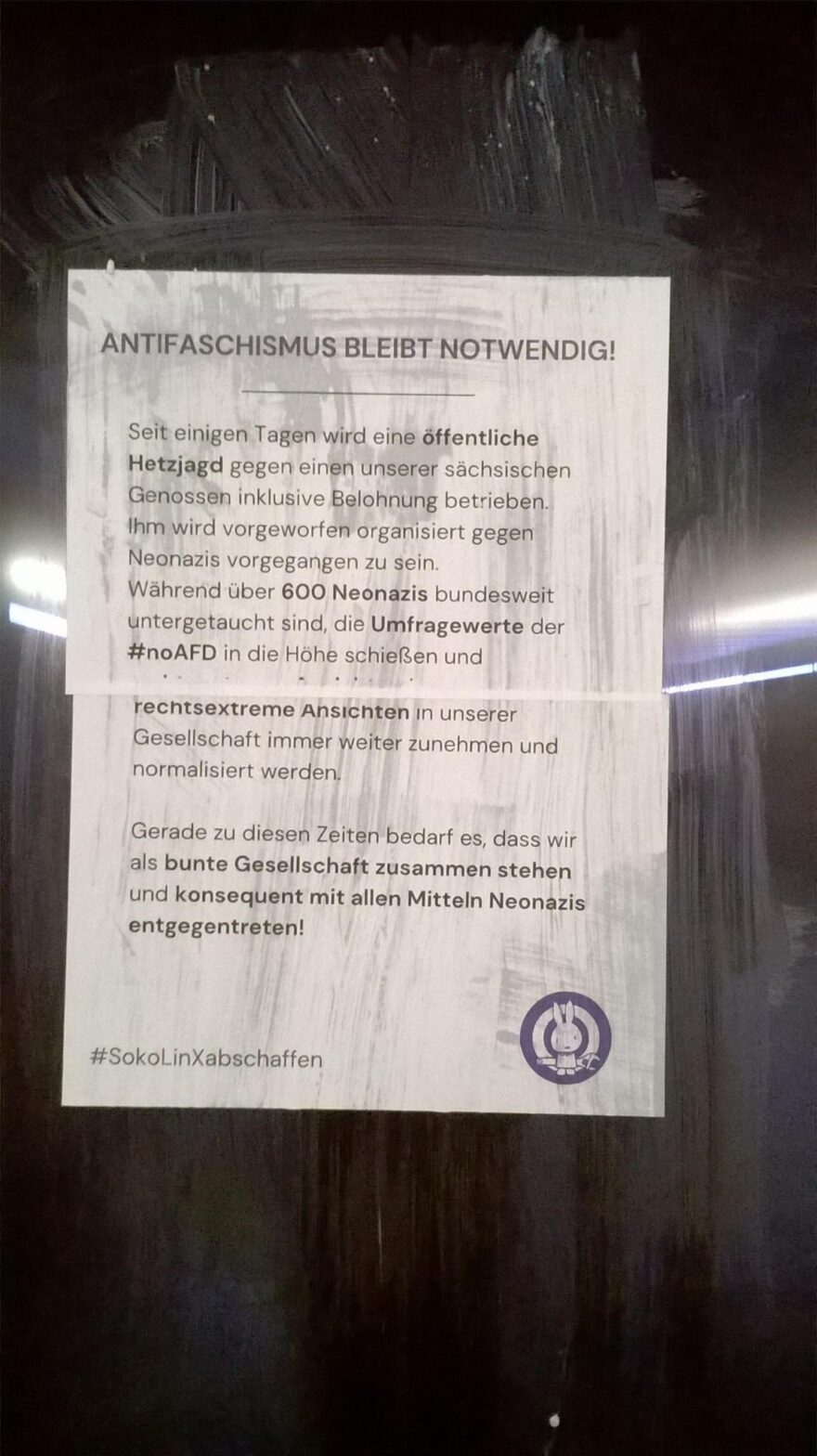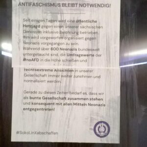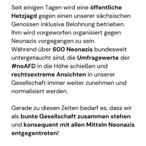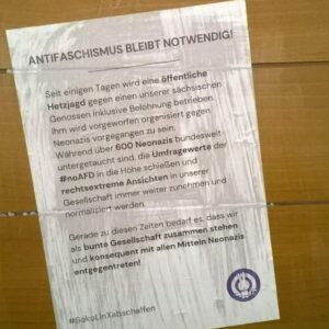 Seit Montag der selben Woche wird eine öffentliche Hetzjagd inklusive Belohnung gegen einen unserer sächsischen Genossen betrieben. Ihm wird vorgeworfen organisiert gegen Neonazis vorgegangen zu sein.