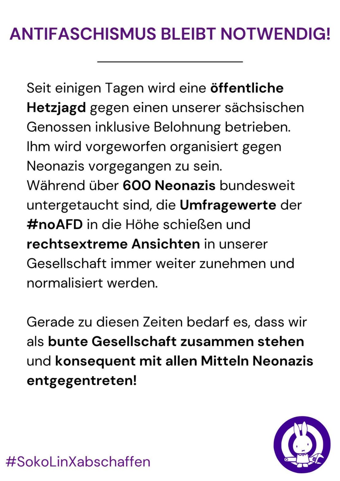 Während über 600 Neonazis bundesweit untergetaucht sind, die Umfragewerte der #noAFD in die Höhe schießen und faschistoide, rassistische, rechtsradikale Ansichten in unserer Gesellschat immer weiter zunehmen und normalisiert werden.