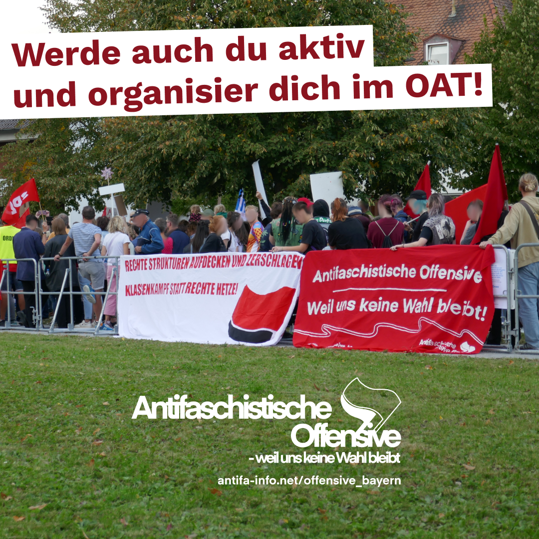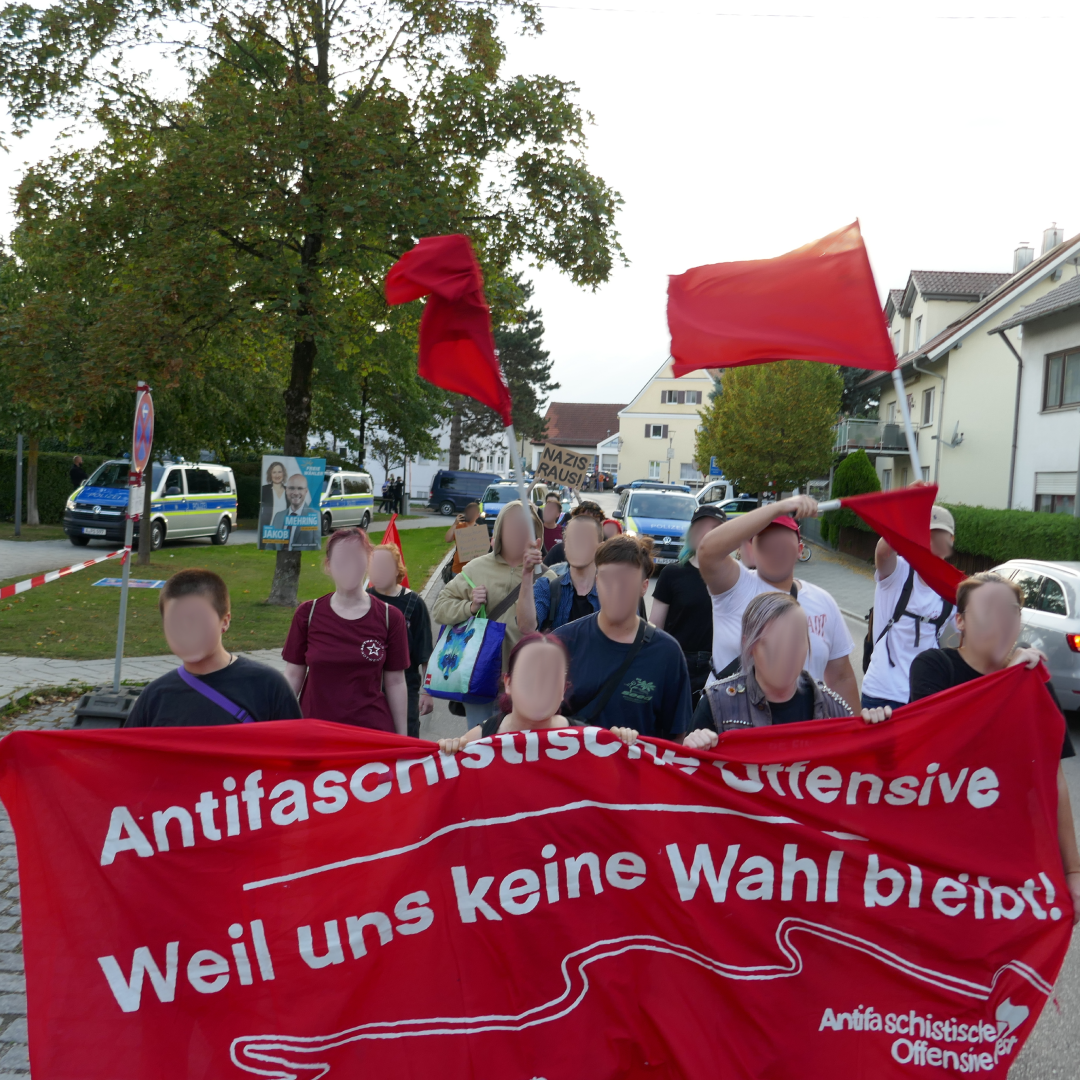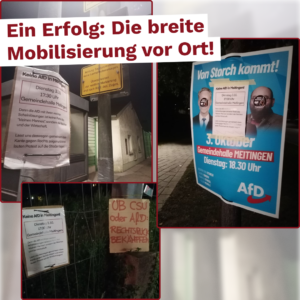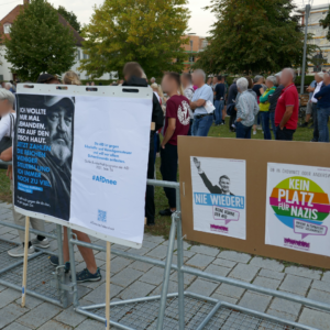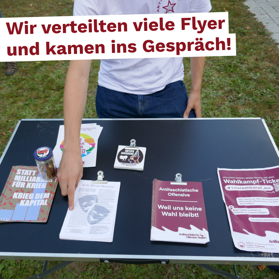Während des Protests hielten wir Reden und verteilten Flyer, um über die AfD aufzuklären. Um diese Inhalte darüber hinaus an die Einwohner*innen Meitingens zu tragen, wurde schon an den Tagen davor mit Flyern und Plakaten über die AfD breitflächig aufgeklärt und zum Gegenprotest mobilisiert.