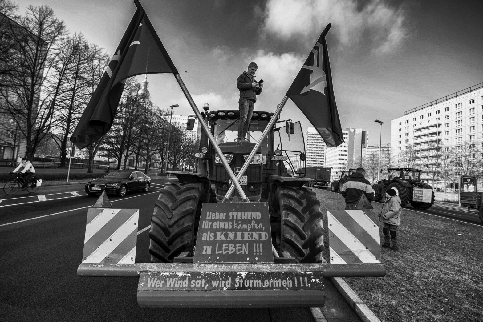 In anderen Landesteilen ging man weniger engagiert gegen die Präsenz von Rechtsradikalen an diesem Tag vor. In Schwerin war Leif-Erik Holm, AfD-Bundestagsabgeordneter, mit vier weiteren AfDlern auf der dortigen Demonstration. In einem Video mit dem Titel »Wir unterstützen unsere Landwirte!« sitzt Holm lachend in einem vorbeifahrenden Traktor mit einem »Klagt nicht, kämpft«-Sticker am Kabinenhäuschen. In Dresden hingegen durfte der im Wahlkreis Sächsische Schweiz direkt gewählte AfD-Landtagsabgeordnete Ivo Teichmann selbst zum Mikro greifen und auf die »etablierte Politik« schimpfen.