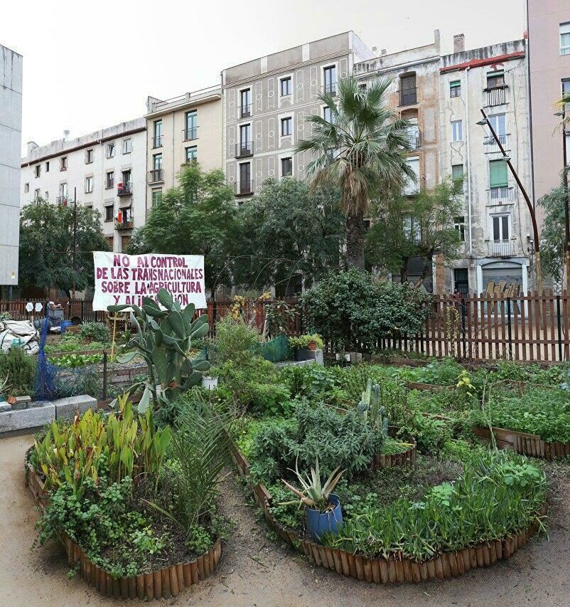 Erst im Jahr 2000 war definitiv klar, was auf der Leerfläche entstehen soll: eine Tiefgarage und ein Sportzentrum. In der Nachbarschaft formierte sich alsbald Widerstand: Das Nachbarschaftskollektiv «Colectivo del Forat» verband sich mit Leuten aus der Hausbesetzer:innenbewegung, die Anfang der 2000er Jahre angefangen hatte, Häuser im Viertel zu besetzen. Gemeinsam besetzten sie die Leerfläche und erschufen einen kollektiven Garten und Begegnungsort. Was folgte, war ein jahrelanger Konflikt zwischen den Behörden auf der einen und den Quartierbewohner:innen und Hausbesetzer:innen auf der anderen Seite. Im Jahr 2002 zerstörte ein grosses Polizeiaufgebot den Garten und umzäunte ihn. Wenige Tage später wurde der Zaun während einer Demonstration wieder abgerissen und der «Schandfleck» erneut kollektiviert. Daraufhin liessen die Behörden über mehrere Jahre von ihren Plänen ab und die Einwohner:innen konnten die Fläche entsprechend ihren Vorstellungen gestalten.