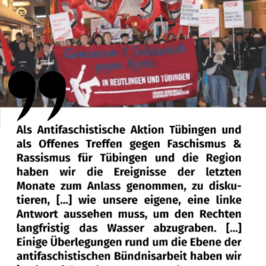 Vor etwa drei Monaten trat die Veröffentlichung der Correctiv-Recherche eine nicht vorhersehbare Dynamik los und tausende Menschen sind in ganz Deutschland gegen Rechts auf die Straße gegangen. Lange ist es her, dass das Arbeitsfeld, in dem wir seit Jahren kämpfen, so viel Beachtung erfahren hat: Eine Chance und Herausforderung zugleich! Doch trotz aller Euphorie und breiter Anti-Rechts-Stimmung, blieb es nicht aus, dass sich manche Veranstalter von antifaschistischen und linken Gruppen distanzierten – also von denen, die schon seit Gründung der AfD auf ihre Gefahr hingewiesen haben. In Tübingen haben wir sehr gut beobachten können, wie CDU und FDP in Leserbriefen und Pressemitteilungen gegen uns schossen, und so versuchten, Fridays For Future als Veranstalter der Kundgebung unter Druck zu setzen. Als Antifaschistische Aktion Tübingen und als Offenes Treffen gegen Faschismus & Rassismus für Tübingen und die Region haben wir die Ereignisse der letzten Monate zum Anlass genommen, um zu diskutieren, wie wir einen Teil der Massenproteste gegen Rechts langfristig in Aktion bringen können und wie unsere eigene, eine linke Antwort aussehen muss, um den Rechten langfristig das Wasser abzugraben. Dafür haben wir uns angeschaut, in welche gesellschaftlichen Situation wir uns aktuell befinden, was den Faschismus an der Macht ausmacht und an welche historischen Debatten und Erfahrungen wir anknüpfen können. Einige Überlegungen rund um die Ebene der antifaschistischen Bündnisarbeit haben wir in dem folgenden Statement kurz zusammengefasst.