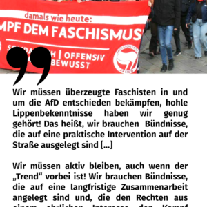 • Wir müssen überzeugte Faschisten in und um die AfD entschieden bekämpfen, hohle Lippenbekenntnisse haben wir genug gehört! Das heißt, wir brauchen Bündnisse, die auf eine praktische Intervention auf der Straße ausgelegt sind, die eine breite Masse an Menschen in Aktion bringen und, für die verschiedene Protestformen gegen Rechts legitim sind!