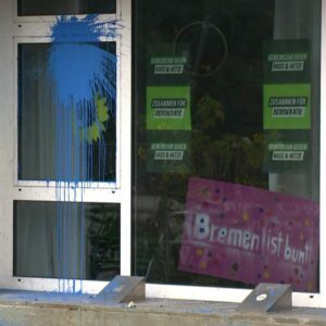 In der brandenburgischen Wahlnacht wurden durch viele kleine Aktionen die Bremer Parteibüros der CDU und FDP und die der SPD und Grünen einen AfD- blauen Anstrich verpasst! AfD blau, weil sich die Regierungsparteien angefeuert durch die CDU, in einer Sache so furchtbar einig sind mit der AfD: Sie müssen jetzt alles tun, um Migration zu stoppen. Damit wird bereits jetzt schon die menschenverachtende, migrationsfeindliche Politik der AfD umgesetzt und der Weg für eine zunehmende Faschisierung bereitet.