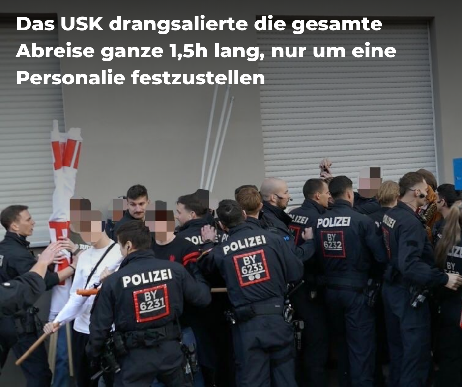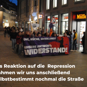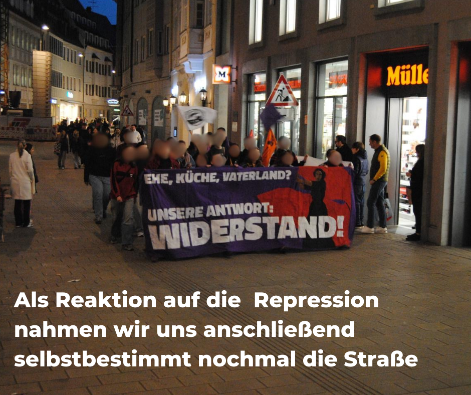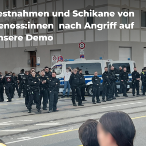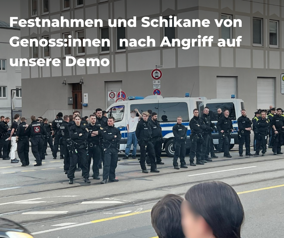 Nachem die Versammlung sich auflöste bewegten wir uns geschlossen zurück Richtung Königsplatz. Um die Identität einer Person festzustellen, griffen uns die Bullen in lächerlich hoher Anzahl an, Menschen wurden gegen eine Fassade gedrückt während ein anderer Teil eingekesselt wurde. Nach c.a 1,5h wurde die Maßnahme beendet.