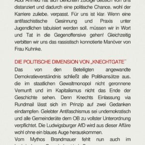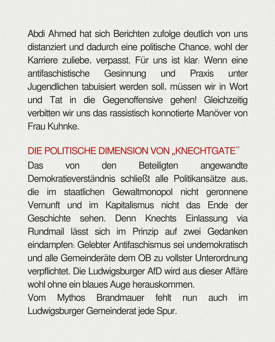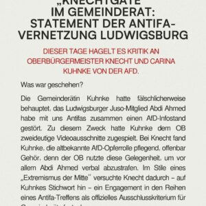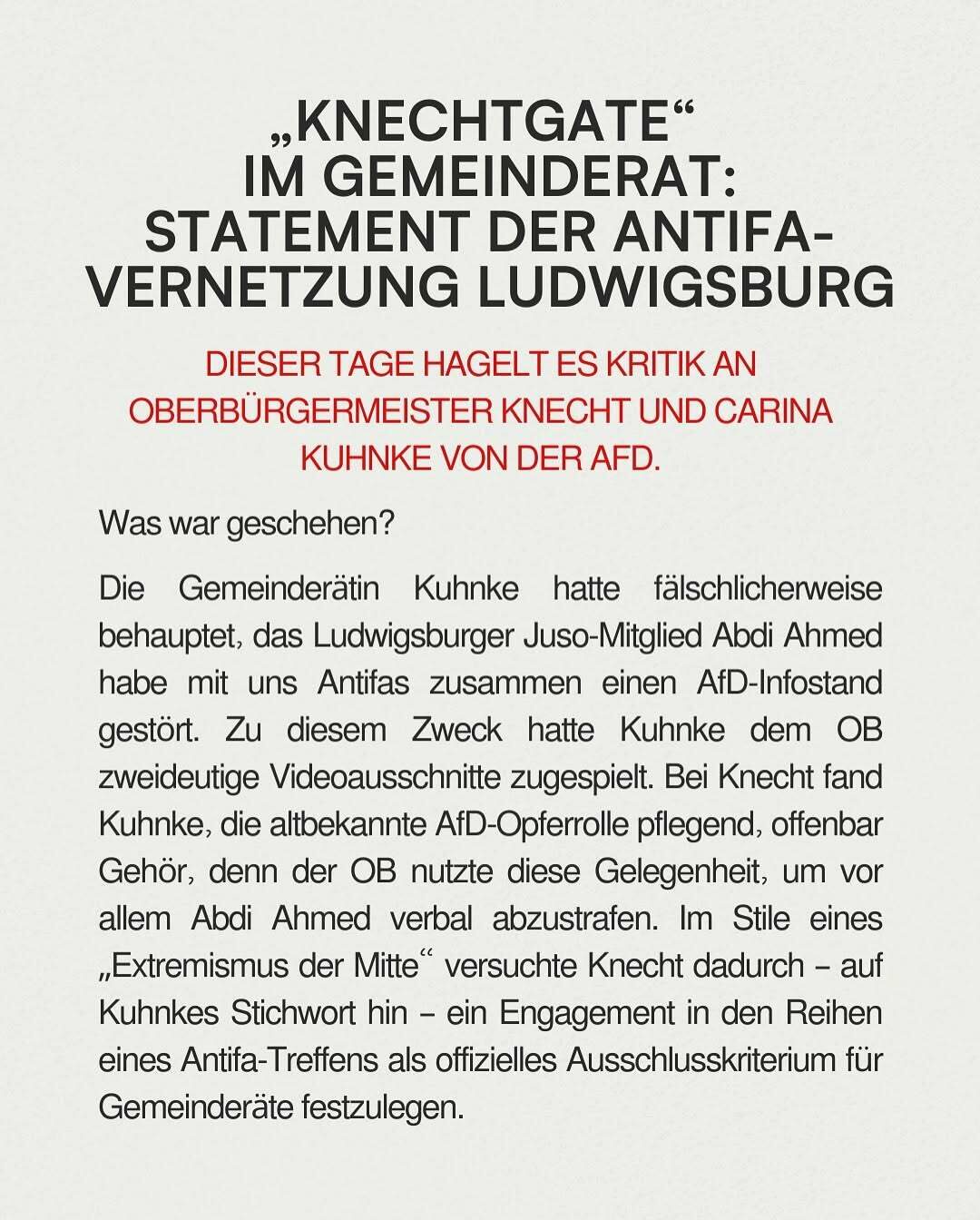 Die Gemeinderätin Kuhnke hatte fälschlicherweise behauptet, das Ludwigsburger Juso-Mitglied Abdi Ahmed habe mit uns Antifas zusammen einen AfD-Infostand gestört. Zu diesem Zweck hatte Kuhnke dem OB zweideutige Videoausschnitte zugespielt. Bei Knecht fand Kuhnke, die altbekannte AfD-Opferrolle pflegend, offenbar Gehör, denn der OB nutzte diese Gelegenheit, um vor allem Abdi Ahmed verbal abzustrafen. Im Stile eines „Extremismus der Mitte“ versuchte Knecht dadurch – auf Kuhnkes Stichwort hin – ein Engagement in den Reihen eines Antifa-Treffens als offizielles Ausschlusskriterium für Gemeinderäte festzulegen.