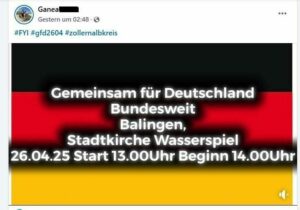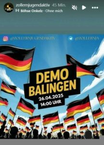 Allerdings mobilisieren bereits verschiedene neofaschistische und neonazistische Gruppen („Zollern-Jugend Aktiv“, „Pforzheim Revolte“, „Unitas Germanica Baden-Württemberg“), Einzelpersonen (Marina Djonovic von „die Heimat“) und Social-Media-Accounts („Balingen Revolte“, „Bodensee Revolte“, „Karlsruhe Revolte“, „Ostalb Revolte“, „Stuttgart Revolte“, „Gegegnrotgrün1161“) auch nach Balingen.