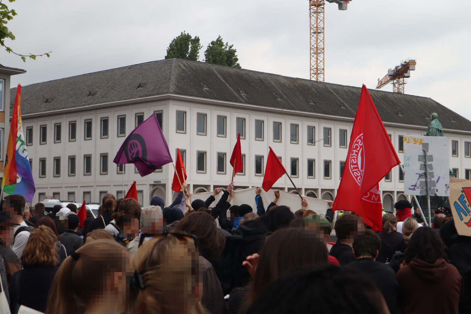 Um unsere eigenen Stärke Ausdruck zu verleihen und einen kollektiven Abschluss zu schaffen zogen wir nach dem Ende der direkten Proteste am Schlossplatz noch zusammen mit hunderten Antifaschist:innen gemeinsam ein kleines Stück durch die Innenstadt und begleiteten die auswärtig Angereisten zum Bahnhof. Für unsere Bewegung war der heutige Tag eine gute Gelegenheit um im Vorfeld des 1. Mai nochmal zusammen zu kommen. Weiter geht’s am Donnerstag um 11:00 Uhr am Festplatz (klassenkämpferischer Teil der DGB-Demo) und um 13:30 Uhr auf dem Friedrichsplatz zur revolutionären 1. Mai Demo, wo wir für eine Perspektive jenseits des Kapitalismus auf die Straße gehen und auch deutlich Position gegen den Rüstungswahn und die Kriegsvorbereitung der Herrschenden setzen. Beteiligt euch auch an diesen Aktionen zahlreich!