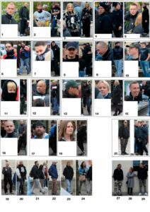 Sie bewegten sich durchgehend als Gruppe (Nr. 1-17), die vor allem aus Jugendlichen bis jungen Erwachsenen bestand. Auffällig war eine ältere Person mit schwarz- weiß- roter Tor Steinar Jacke und auffälligen Ringen/ Tattoos (Nr. 12). Dieser stand meist etwas abseits der jüngeren Leute, war aber im regen Austausch mit ihnen. Es wirkte so, als ob er Anweisungen geben würde. Mit ihm interagierten vor allem Nr. 13-16, sie bewegten sich aber meist in unmittelbarer Nähe zu der Gruppe Jungnazis.