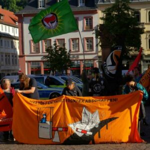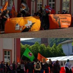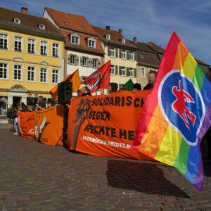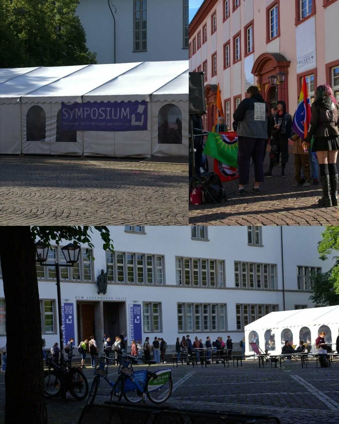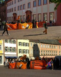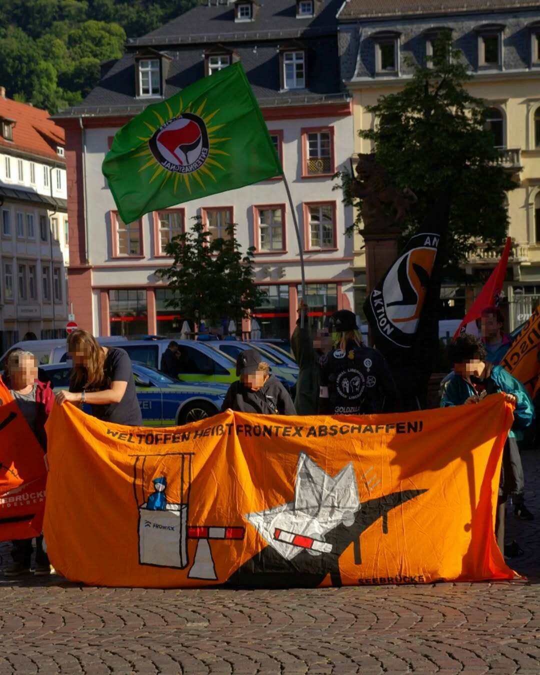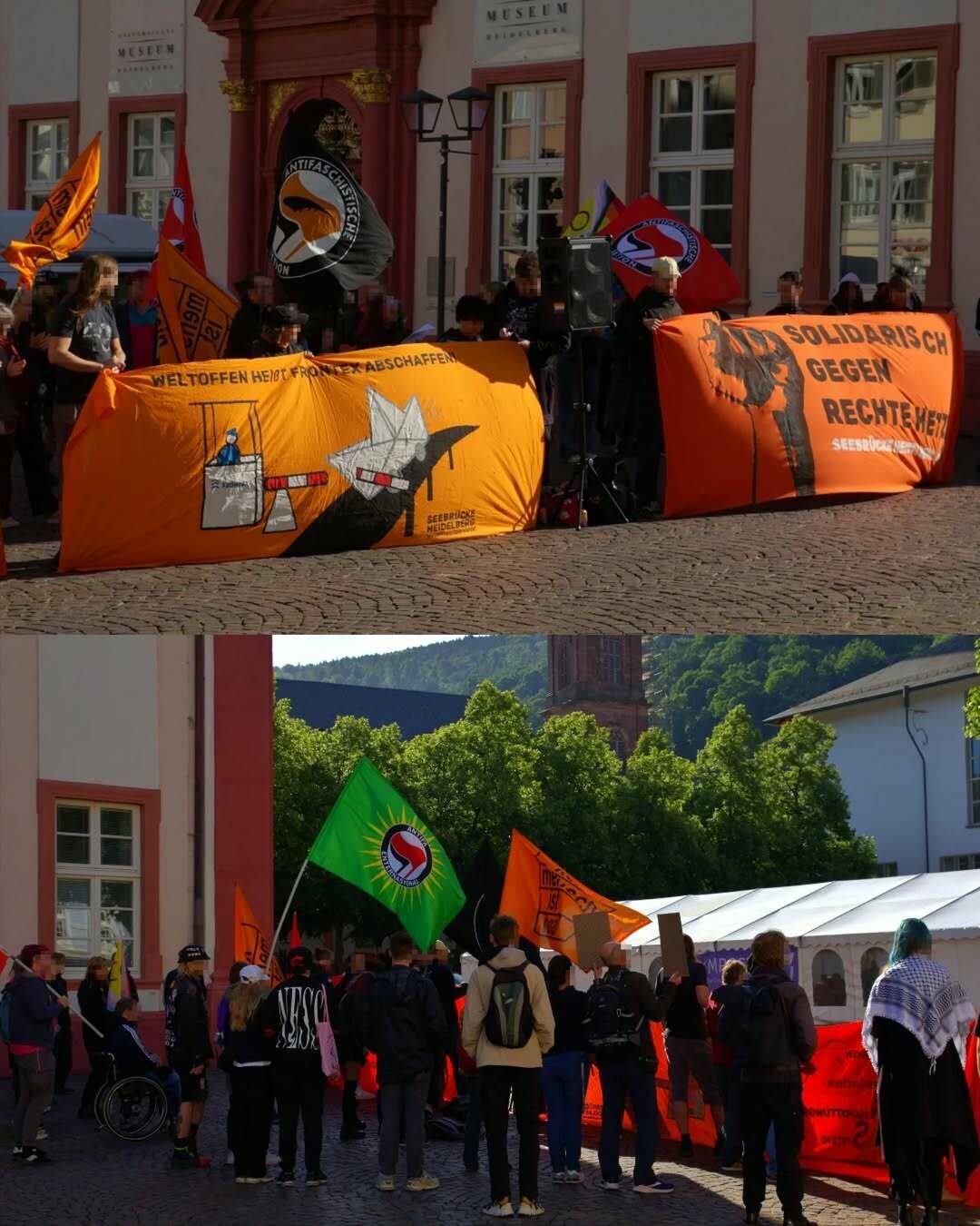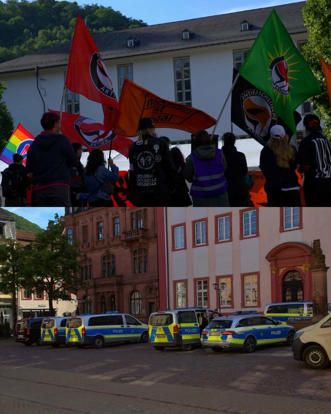 50 solidarische Menschen haben sich am frühen Samstagmorgen auf dem Heidelberger Uniplatz eingefunden, um gegen den Auftritt des