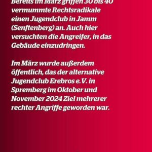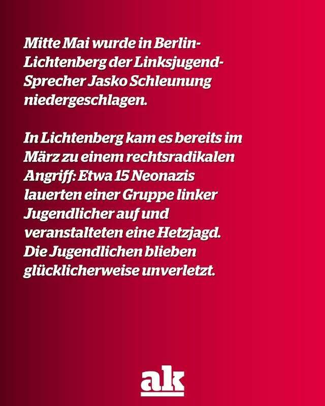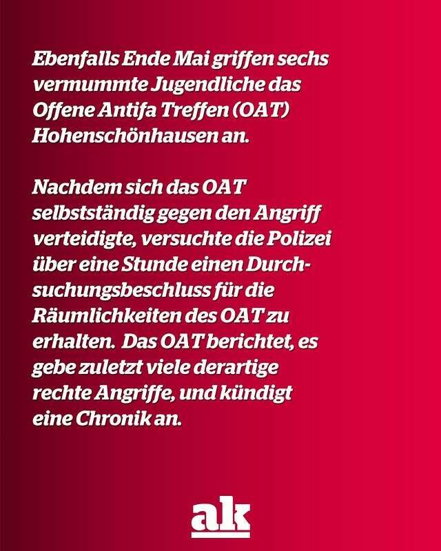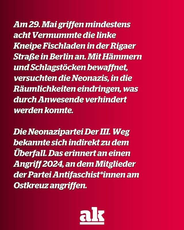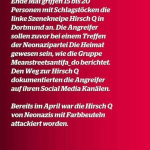 In der Nacht vom 30.05. auf den 31.05. griffen Faschist:innen die linksalternative Kneipe Hirsch-Q1https://instagram.com/p/DKUmn4tMX4L/ in Dortmund an. Die Angreifer versuchten in das Gebäude einzudringen und legten einen Brand. Auch in Berlin nehmen sich seit ca. einem Jahr Faschist:innen des „III. Weg“ den öffentlichen Raum2/2024/07/20/oeffentliche-raumnahme-und-kampfsporttrainings-durch-rechten/ und treiben ihr Unwesen3/2024/07/11/nach-organisiertem-naziangriff-auf-antifaschistinnen/. Ende Mai attackierten sie mit Hämmern eine linke Szenekneipe in der Rigaer Straße in Berlin.4https://www.ausdemweg.net/29-mai-2025-iii-weg-provokation-in-friedrichshain/  Desweiteren wurde das OAT Hohenschönhausen5https://instagram.com/p/DKS__euo0OA/ von jungen Rechten angegangen und versucht einzuschüchtern. Auch in der Pfalz gab einen einen Angriff auf Antifaschist:innen. Bei dem Fest der Demokratie in Böhl-Iggelheim wurde ein Aktivist,  im Zuge einer Straßenmalaktion gegen die AfD, misogyn und transphob beleidigt, und im Anschluss von einem AfD-Mitglied in Gesicht geschlagen.