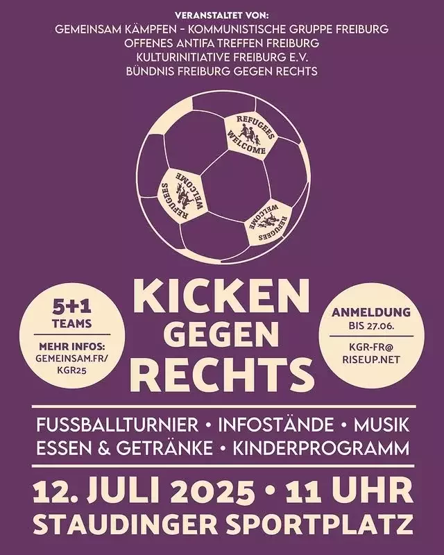 Wir, das Offene Antifa Treffen Freiburg, Gemeinsam Kämpfen – Kommunistische Gruppe Freiburg, das Bündnis Freiburg gegen Rechts und die Kulturinitiative Freiburg e.V. laden am 12. Juli zum Kicken gegen Rechts 2025 in Freiburg ein! Kicken gegen Rechts 2025 ⚽️