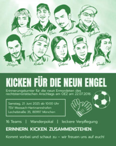 Die Initiative München OEZ Erinnern lädt euch herzlich zu einem besonderen Fußballturnier ein. Gespielt wird um einen Wanderpokal, der für Gedenken und unvergessene Momente stehen soll.