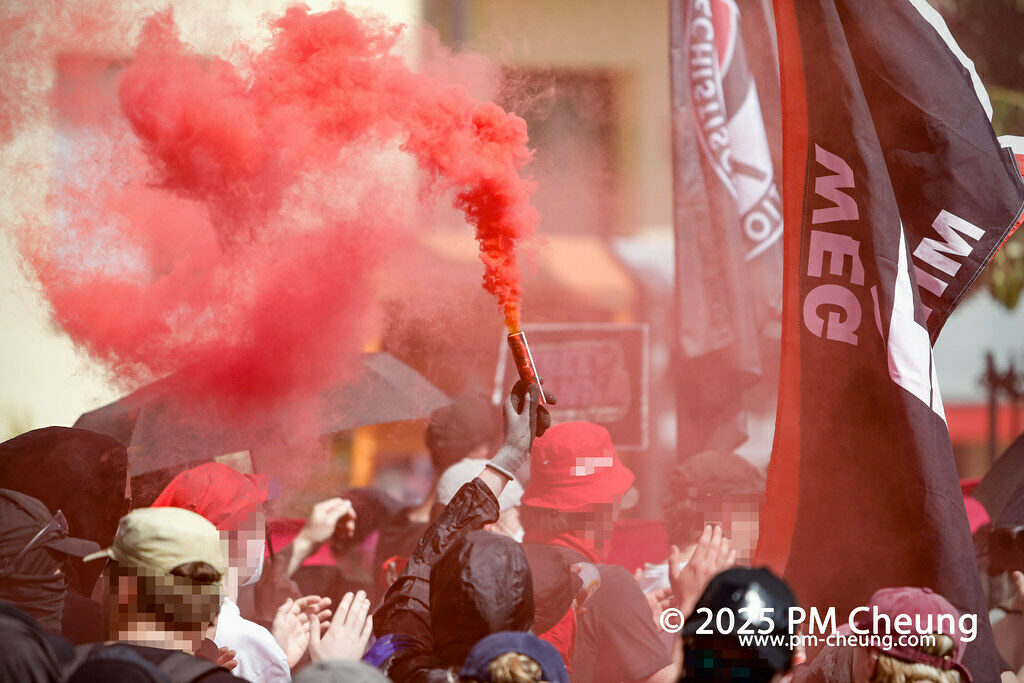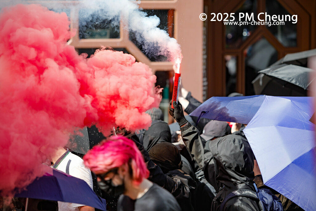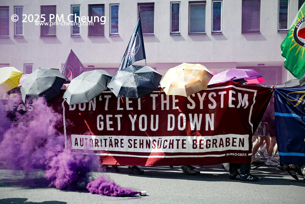Am Rand der Demonstration stehen in Gruppen Dutzende Polizeikräfte. Doch sie halten sich weitgehend zurück. Auch als manche Demonstranten Bengalo-Fackeln anzünden, intervenieren sie nicht. Bis Redaktionsschluss waren keinerlei Identitätsfeststellungen bekannt. Allerdings filmten Beamte den Aufzug.