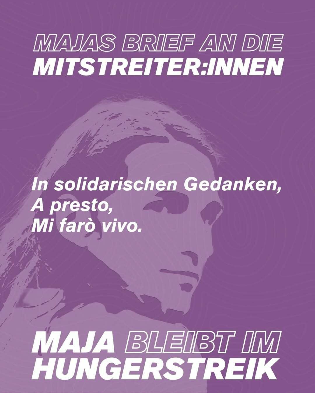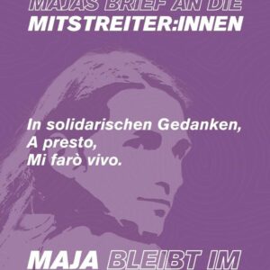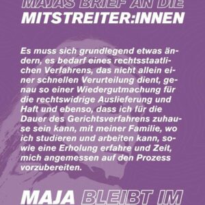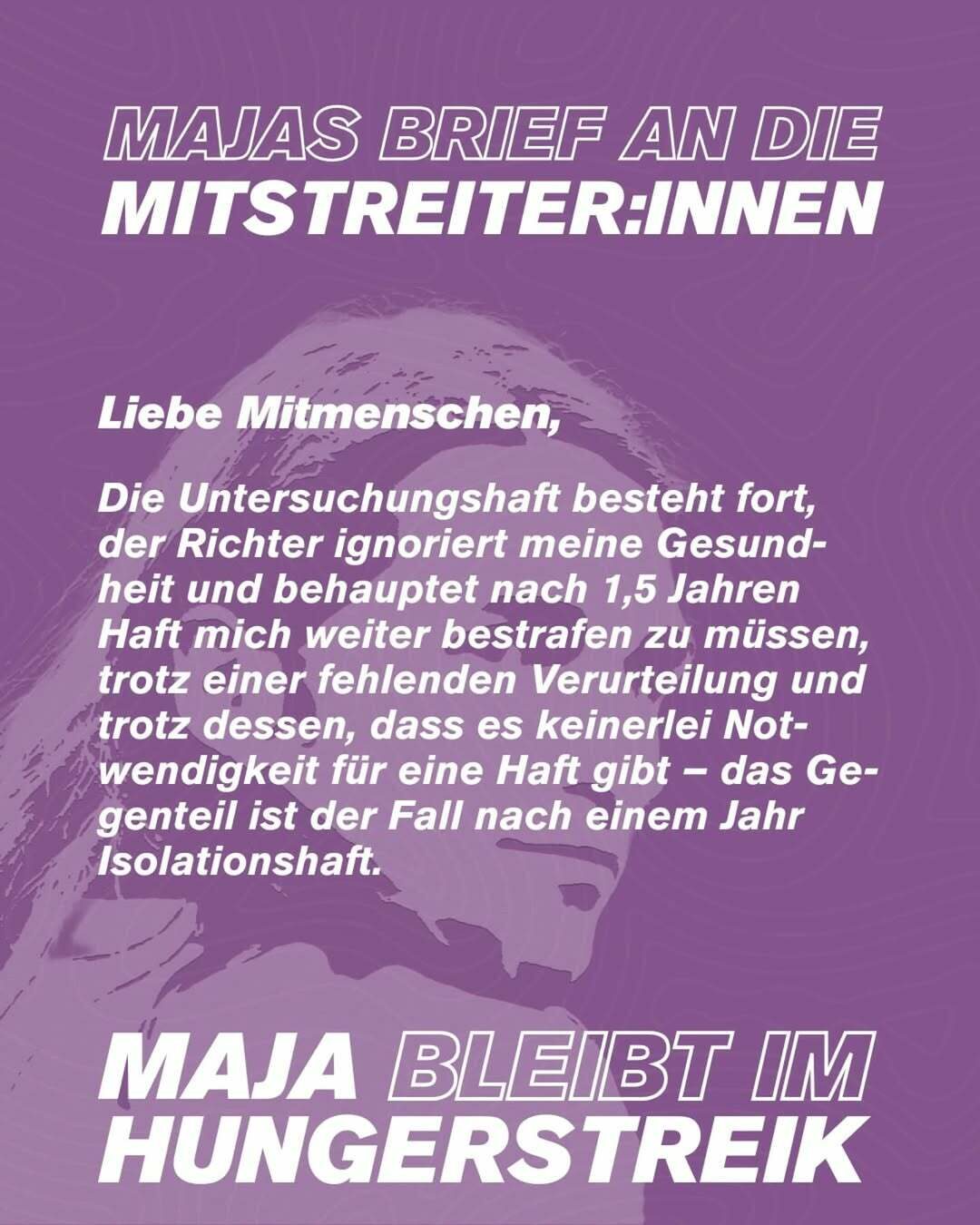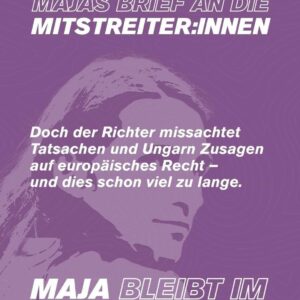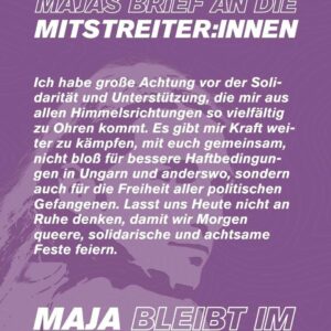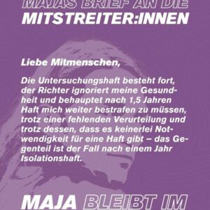 Wir spiegeln anbei Majas Brief an alle Mitstreiter:innen und senden Maja solidarische Grüße nach Ungarn. Es bleibt abzuwarten wie es im Fall Maja weitergeht. Für uns ist eines klar! Wir stehen geschlossen hinter Maja und allen angeklagten im Budapest-Komplex. Am Wochenende standen die bundesweiten Aktionstage an, bei welchen nochmal konkret auf den Fall Maja aufmerksam gemacht werden soll. Für weitere Infos schaut gerne bei der Kampagnenseite rund um den Budapest-Komplex vorbei. Außerdem gibt es einen gesonderten Instagramaccount, der explizit den Fokus auf Majas Fall gelegt hat.