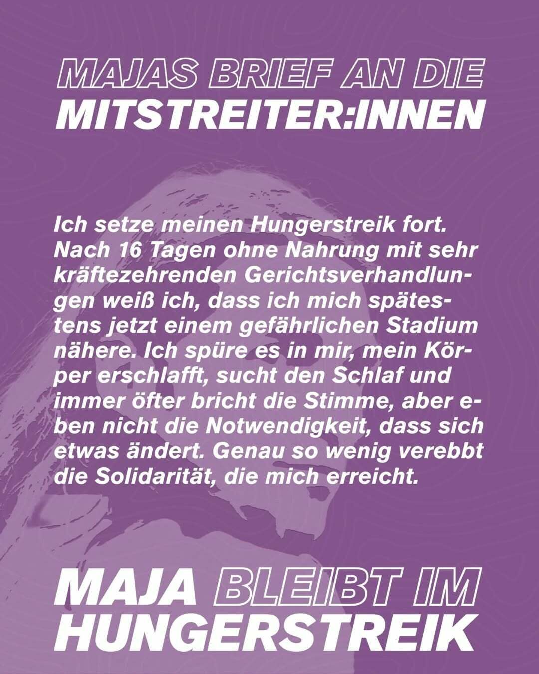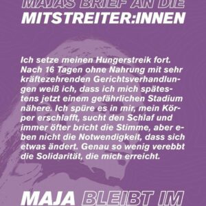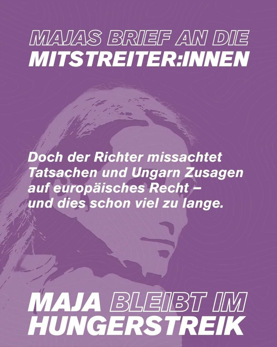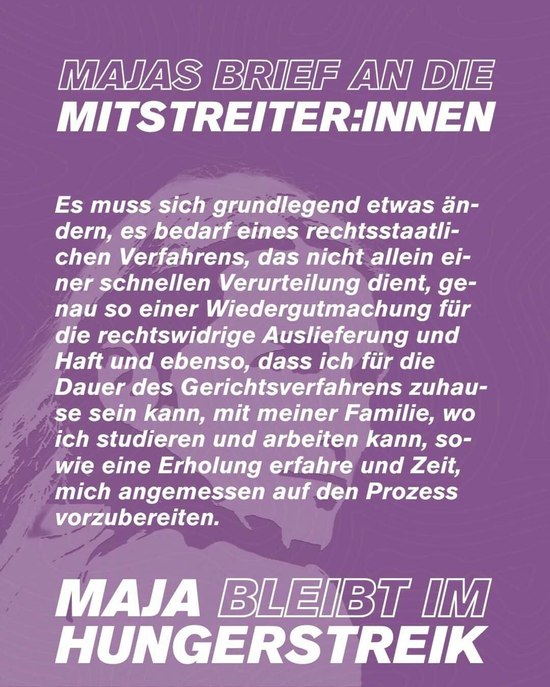 Darüber hinaus werden Briefe, Telefonate und Besuche massiv eingeschränkt, weshalb Maja jetzt vor zwei Wochen in den Hungerstreik getreten ist. Maja sieht dies als einer der letzten Möglichkeiten gegen die Haftbedingungen, sowie gegen die rechtswidrige Auslieferung vorzugehen. Bis vor kurzem gab es dennoch keinerlei Veränderungen, weder bei den ungarischen Behörden noch in Deutschland. Mittlerweile ist aber wahrzunehmen, dass der Fall Maja auch die bürgerliche Medienwelt erreicht – seit dieser Woche werden auf unterschiedlichen Sendern die Haftbedienungen sowie die Auslieferungen thematisiert. Trotz des nun auch medialen Drucks gibt es keine Anzeichen dafür, dass die deutschen Behörden einen Schritt auf Maja zu gehen – im Gegenteil. Die neuste Entwicklung gibt aber Hoffnung, dass sich die Bedingungen in Haft etwas verbessern. Der Hungerstreik zeigt Wirkung – seit Anfang der Woche gab es für Maja einige kleine Zugeständnisse seitens der Haftanstalt, wie regelmäßige Hofgänge und Telefonate.