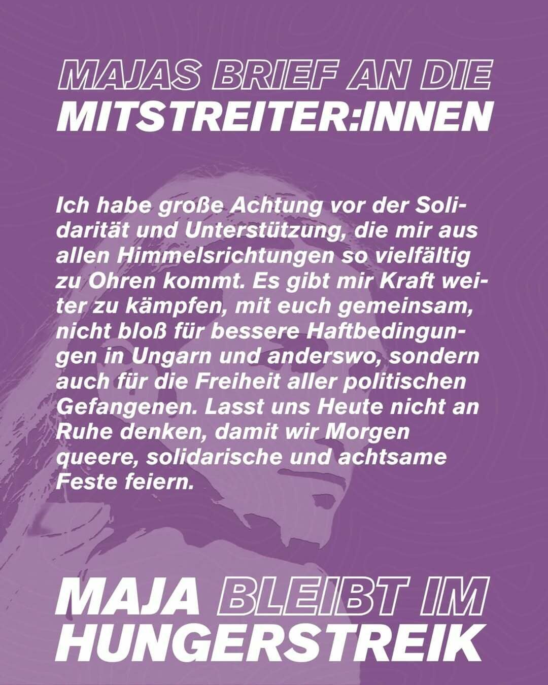 Ich habe große Achtung vor der Soli- darität und Unterstützung, die mir aus allen Himmelsrichtungen so vielfältig zu Ohren kommt. Es gibt mir Kraft weiter zu kämpfen, mit euch gemeinsam, nicht bloß für bessere Haftbedingungen in Ungarn und anderswo, sondern auch für die Freiheit aller politischen Gefangenen. Lasst uns Heute nicht an Ruhe denken, damit wir Morgen queere, solidarische und achtsame Feste feiern.