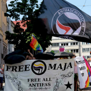 Der Block hat ein Zeichen der Solidarität für die nicht-binäre inhaftierte Antifaschist*in Maja auf die Straße getragen. Maja wurde aus Deutschland rechtswidrig in das autoritären und queerfeindlichen Ungarn ausgeliefert und sitzt dort seit Monaten in Isolationshaft. Unter anderem wegen der menschen-verachtenden Haftbedingungen befindet sich Maja seit 3 Wochen im Hungerstreik. Wir unterstützen die Forderungen nach Konsequenzen für die rechtswidrige Auslieferung von Maja und die Rücküberstellung Majas nach Deutschland.