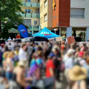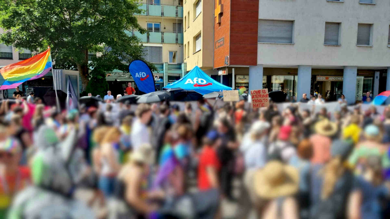 Die Notwendigkeit hierfür wurde am CSD wieder einmal klar: die Ulmer und Neu-Ulmer AfD versuchten an dem Tag mit Infoständen zu provozieren. Besonders zu erwähnen ist ein Infostand genau an der Route und in Sichtweite des Abschlussfestes des CSDs vom völkisch-nationalistischen MdL Franz Schmid. Schmid und seine Kameraden versuchten, die Demonstrierenden an der Demoroute abzufilmen und im Internet bloßzustellen. Auf seinen Kanälen findet sich das übliche gelogene AfD Framing – CSDs werden als perversiert und als “Gefahr für Kinder” dargestellt. Dieser krampfhafte Versuch aus jeder Puppy Mask ein Kulturkampf zu skandalisieren ist lächerlich. Ironischerweise trugen beim AfD Infostand die Kameraden selbst genauso viel Leder(hosen), wie wir auf der gesamten Pride gesehen haben. (Es sah sehr warm aus)