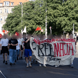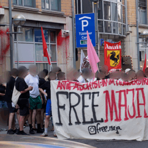 In einer Rede wiesen wir auf die untragbaren Haftbedingungen und Situation von Maja hin und unterstrichen die Notwendigkeit von organisierter, kämpferischer Antifaarbeit von unten.