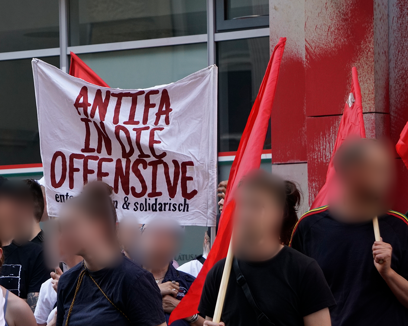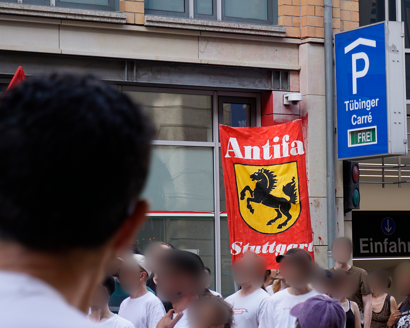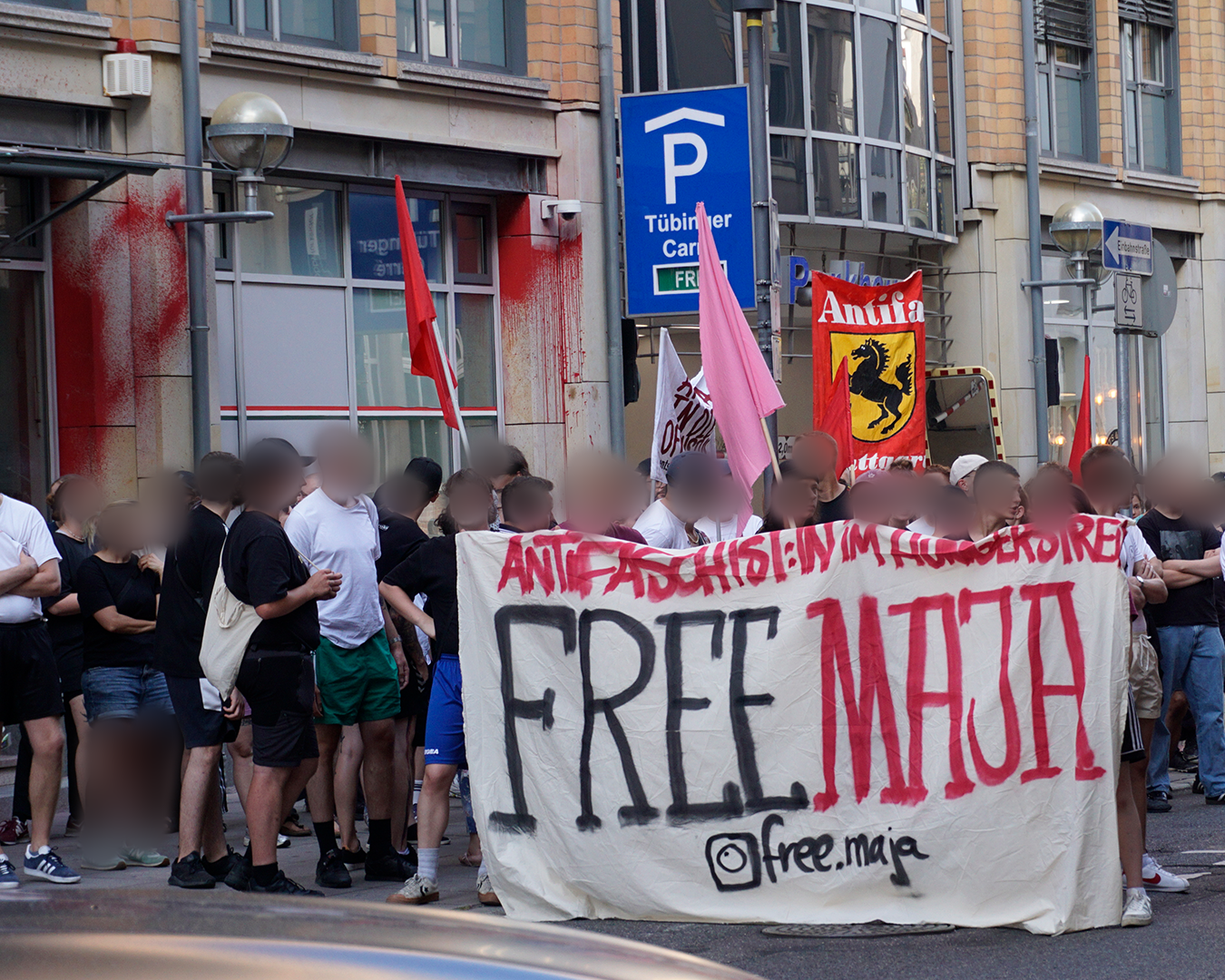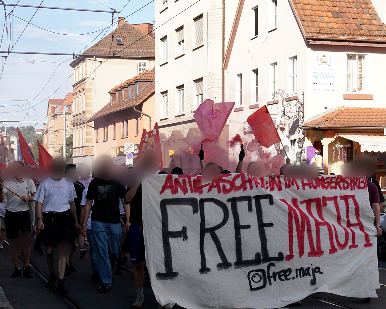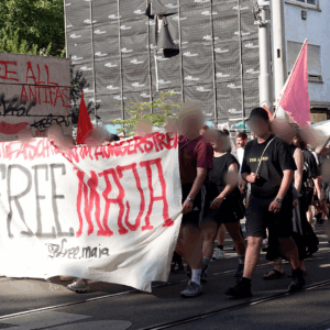 Heute befindet sich Maja seit einem Monat im Hungerstreik. Gestern hat die Bundesanwaltschaft Anklage gegen sechs weitere Antifaschist:innen eingereicht, die in Budapest Nazis ihren „Tag der Ehre“ vermiest haben sollen. Mit 100 Antifaschist:innen haben wir deswegen heute vor dem ungarischen Konsulat Stuttgart unsere Solidarität mit Maja, ihrem Kampf gegen den ungarischen Staat und für selbstbestimmte antifaschistische Arbeit auf die Straße getragen.