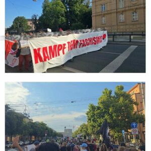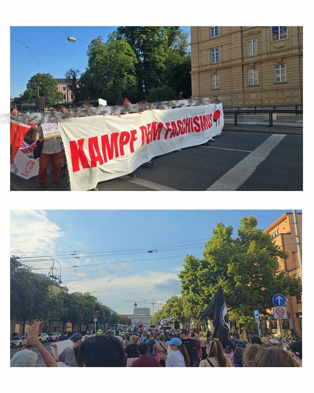 Kurz darauf startete vom Königsplatz eine Demonstration gegen die Lesung Sellners zu der trotz kurzfristiger Mobilisierung, enormer Hitze und reihenweise Antifaschist:innen, welche sich in den Polizeimaßnahmen befanden, rund 250 Personen kamen. Auf der kämpferischen Demonstration wurde nicht nur gezeigt, dass Sellner und andere Faschist:innen in Augsburg nicht willkommen sind, sondern auch die heftige Repression der Polizei verurteilt. Außerdem wurde sich immer wieder mit der in Ungarn inhaftierten Maja und allen anderen Antifaschist:innen in Haft solidarisiert. Erst nach Ende der Demo wurde der Kessel in Oberhausen nach 20 Uhr plötzlich für beendet erklärt.