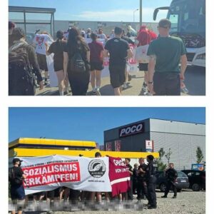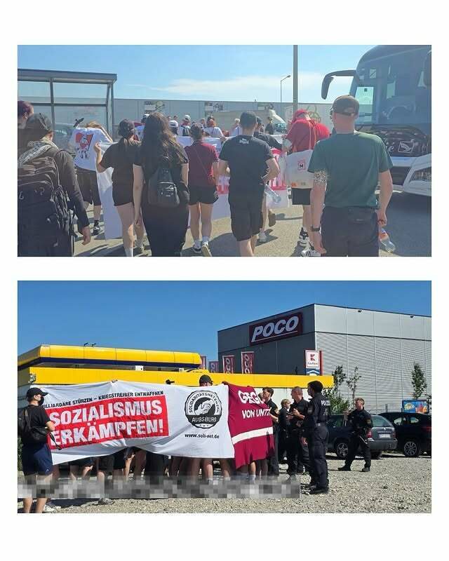 Das wurde von 30 konsequenten Antifaschist:innen nicht unbeantwortet gelassen, welche einen spontanen Gegenprotest organisierten und die Abfahrt der Nazis verzögern konnten. Die Augsburger Polizei war jedoch auch sofort zur Stelle um die Faschos zu beschützen und so wurden die Protestierenden nach kurzer Zeit in einem Kessel festgehalten. Dort schikanierte sie die Polizei für 4 Stunden bei Temperaturen über 30 Grad. Auch als nach 2 Stunden die erste Person kollabierte und ein Krankenwagen gerufen werden musste setzte die Polizei die Maßnahme auf unbestimmte Zeit fort und drohte damit, dass jede einzelne Person für Erkennungsdienstliche Behandlungen auf die Dienststelle mitgenommen werde. Zwei weitere Genoss:innen wurden wenige hundert Meter entfernt in einem Auto festgenommen, welches daraufhin durchsucht wurde, und verbrachten mehrere Stunden, bis in die Nacht in Gewahrsamzellen bevor sie nach einer ED-Behandlung entlassen wurden.