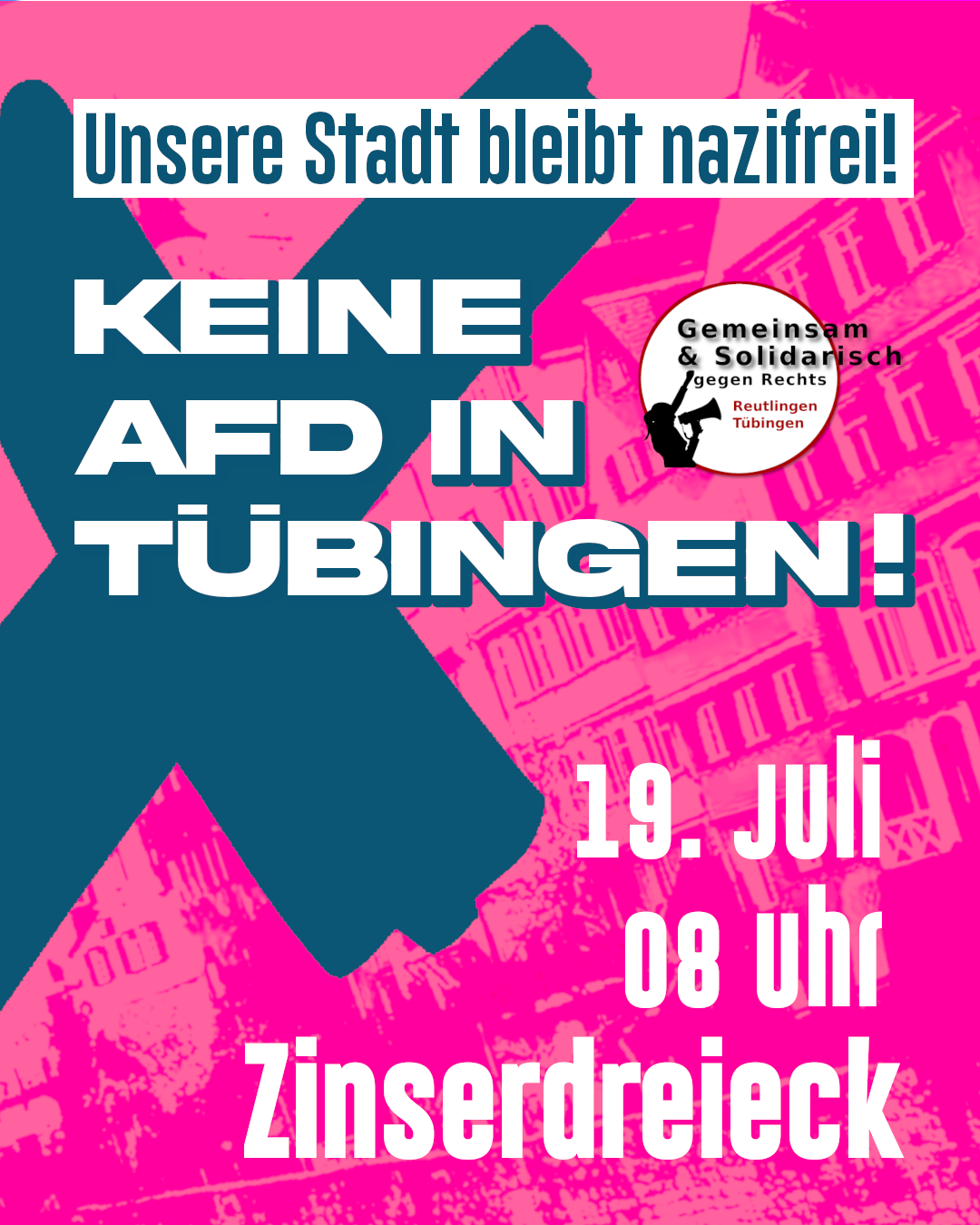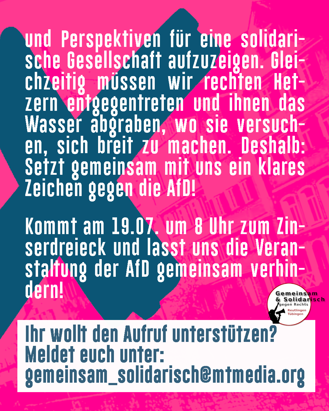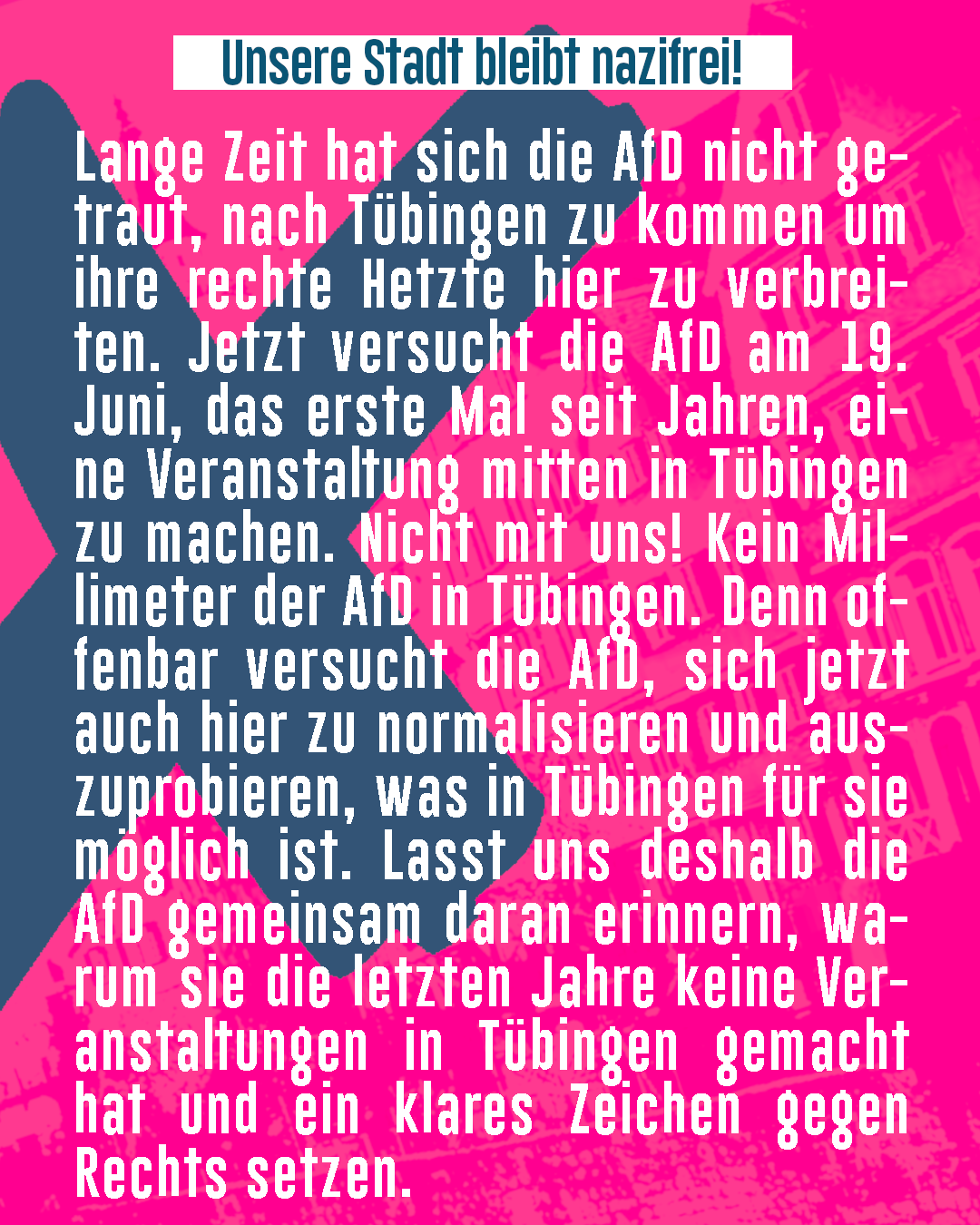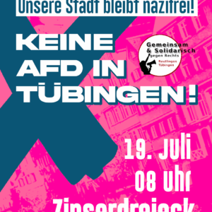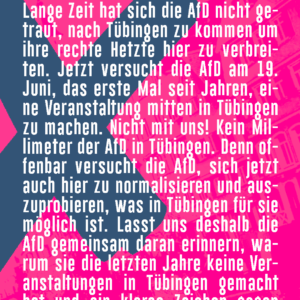 Lange Zeit hat sich die AfD nicht getraut, nach Tübingen zu kommen und ihre rechte Hetze hier zu verbreiten. Jetzt versucht die AfD am 19.07., das erste Mal seit Jahren, eine Veranstaltung mitten in Tübingen zu machen. Nicht mit uns! Kein Millimeter der AfD in Tübingen. Denn offenbar versucht die AfD, sich jetzt auch hier zu normalisieren und auszuprobieren, was in Tübingen für sie möglich ist. Lasst uns deshalb die AfD gemeinsam daran erinnern, warum sie die letzten Jahre keine Veranstaltungen in Tübingen gemacht hat, und ein klares Zeichen gegen Rechts setzen. Damit die AfD nicht so schnell wieder kommt.