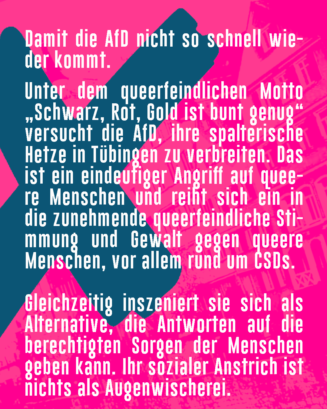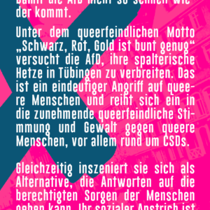 Unter dem queerfeindlichen Motto „Schwarz, Rot, Gold ist bunt genug“ versucht die AfD, ihre spalterische Hetzte in Tübingen zu verbreiten. Das ist ein eindeutiger Angriff auf queere Menschen und reiht sich ein in die zunehmende queerfeindliche Stimmung und Gewalt gegen queere Menschen, vor allem rund um CSDs.