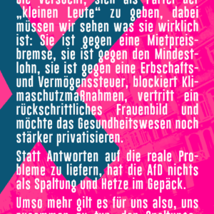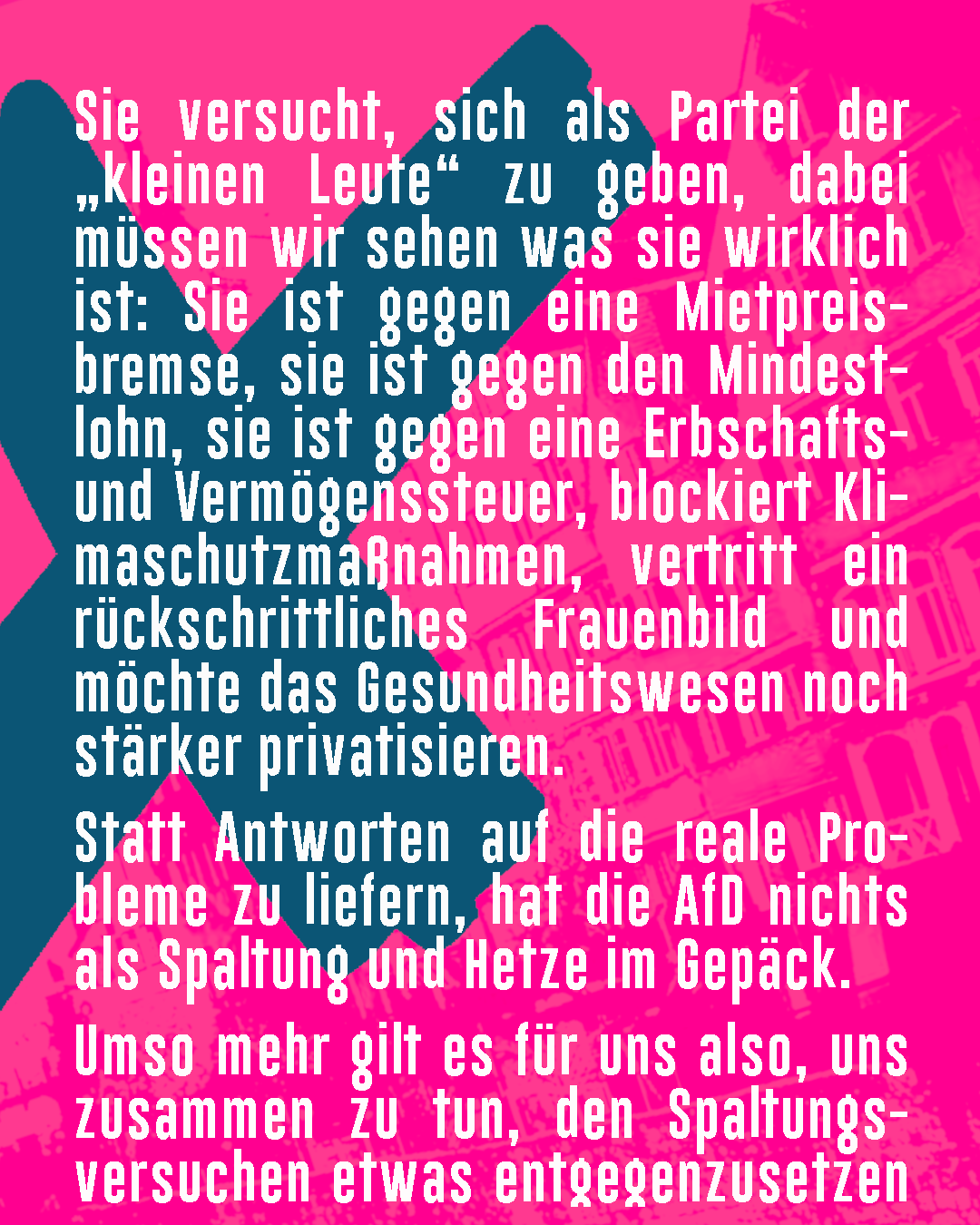 Statt Antworten auf die realen Probleme zu liefern, hat die AfD nichts als Spaltung und Hetze im Gepäck. Umso mehr gilt es für uns also, uns zusammen zu tun, den Spaltungsversuchen etwas entgegenzusetzen und Perspektiven für eine solidarische Gesellschaft aufzuzeigen. Gleichzeitig müssen wir rechten Hetzern entgegentreten & ihnen das Wasser abgraben, wo sie versuchen, sich breit zu machen.