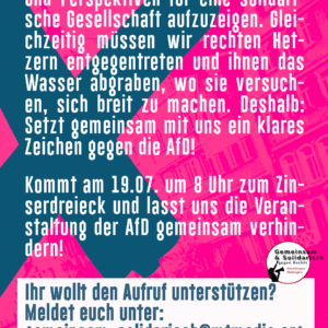Kommt am 19.07. um 8 Uhr zum Zinserdreieck und lasst uns die Veranstaltung der AfD gemeinsam verhindern.