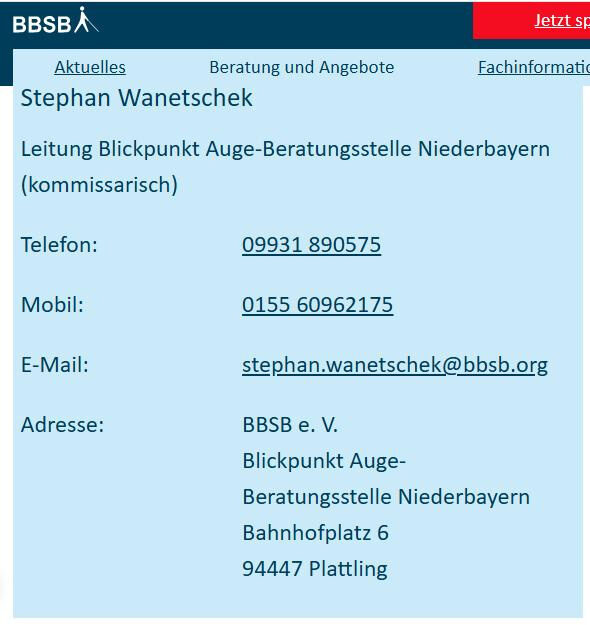 Vor wenigen Wochen wurde in der niederbayerischen Presse bekannt, dass Stephan Mühlberger sich inzwischen – angelehnt an den Nachnamen seiner Ehefrau – Stephan Wanetschek nennt. Unter diesem Namen ist er seit 01.01.2025 vom Landesvorstand des Bayerischen Blinden- und Sehbehindertenbund e.V. (BBSB) als kommissarischer Bezirksgruppenleiter für den Bezirk Niederbayern eingesetzt. In diesem Ehrenamt leitet er die BBSB-Blickpunkt-Auge-Beratungsstelle Niederbayern in Plattling, hält monatlich niederbayernweit Veranstaltungen, kulturelle und Freizeitangebote, Beratungstage, Stammtische und Hausbesuche ab.