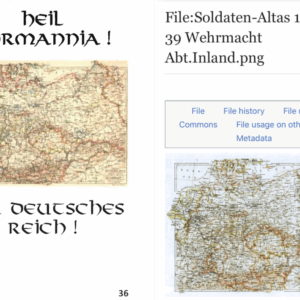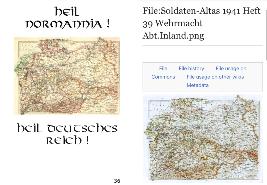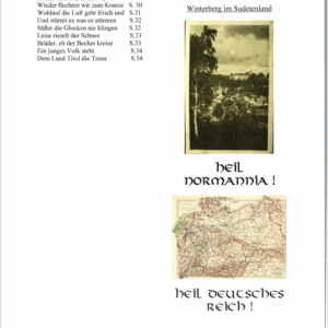 „Heil Normannia“ prangt dort als Schriftzug unter einem Bild des Panoramas der tschechischen Stadt Vimperk, hier bezeichnet mit dem deutsche Namen „Winterberg“ und darunter „Heil Deutsches Reich“. Dazu eine Karte des Deutschen Reiches, welche aus dem „Soldaten-Atlas; Reihe: Tornisterschrift des Oberkommandos der Wehrmacht 1941, Heft 39; Herausgeber: Oberkommando der Wehrmacht, Abteilung Inland“ stammen dürfte. Beim Deutschen Reich des 19. und 20. Jahrhunderts unterscheidet man allgemein mehrere Perioden: die Monarchie des Deutschen Kaiserreichs (1871–1918), die pluralistische, semipräsidentielle Demokratie der Weimarer Republik (1918/19–1933) und die Diktatur des NS-Staates in der Zeit des Nationalsozialismus (1933 bis 1945) – die Karte von 1941 ist wohl letzterem zuzuordnen.