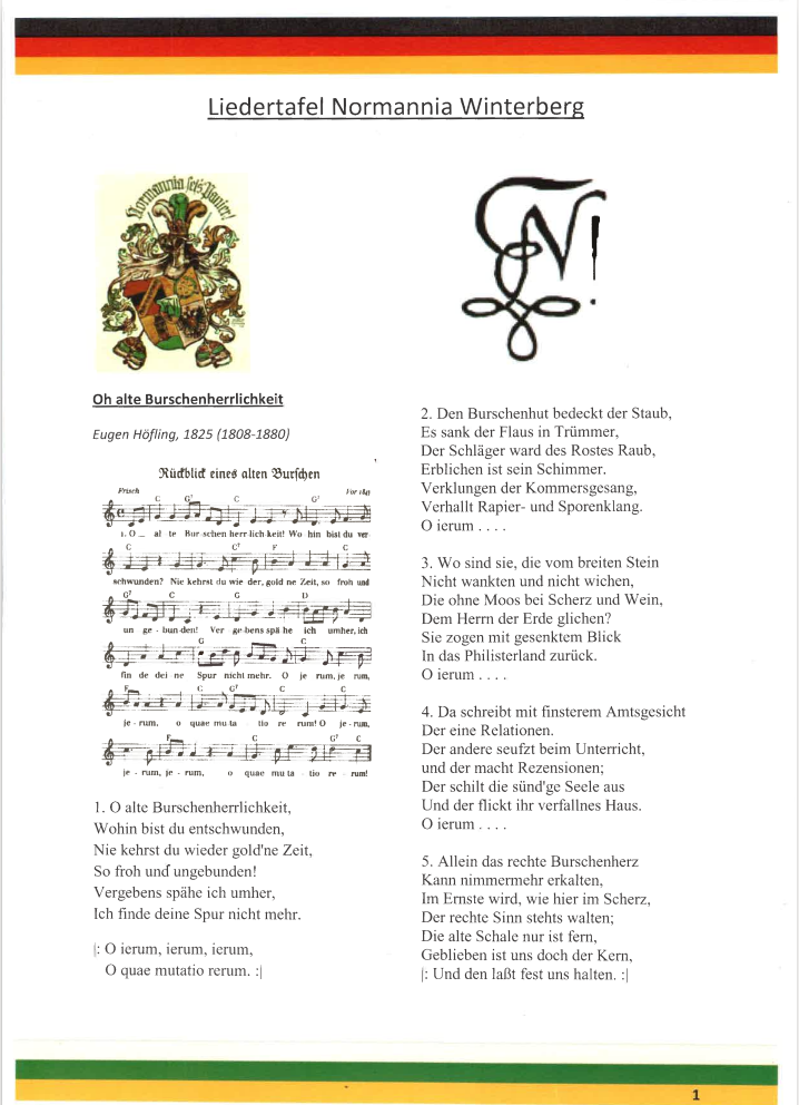„Deutschlandlied“: Das Lied der Deutschen, auch Deutschlandlied genannt, wurde von August Heinrich Hoffmann von Fallersleben am 26. August 1841 auf Helgoland gedichtet. Seine dritte Strophe ist der Text der deutschen Nationalhymne. Zur Zeit des Nationalsozialismus (1933–1945) wurde nur die erste Strophe gesungen, auf die stets das Horst-Wessel-Lied folgte. Im Normannia Liederbuch finden sich alle drei Strophen, beginnend mit „Deutschland, Deutschland über alles, Über alles in der Welt, Wenn es stets zu Schutz und Trutze, Brüderlich zusammenhält, Von der Maas bis an die Memel, Von der Etsch bis an den Belt – ….“