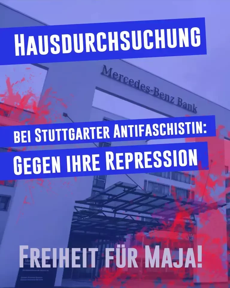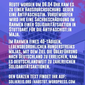 Heute [18.08.25] morgen um 06.04 Uhr kam es zu einer Hausdurchsuchung gegen eine Antifaschistin. Vorgeworfen wird ihr eine Sachbeschädigung im Rahmen einer Solidaritätsaktion in Stuttgart für die Antifaschist:in Maja.