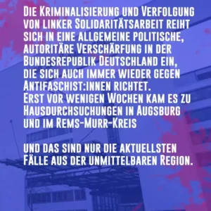 Die Kriminalisierung und Verfolgung von linker Solidaritätsarbeit reiht sich in eine allgemeine politische, autoritäre Verschärfung in der Bundesrepublik Deutschland ein, die sich auch immer wieder gegen Antifaschist:innen richtet. Erst vor wenigen Wochen kam es zu Hausdurchsuchungen in Augsburg (Vorwurf: Blockade gegen den IBler Martin Sellner) und im Rems-Murr-Kreis (Vorwurf: Angriff auf eine die „Die Heimat“-Kaderin) – und das sind nur die aktuellsten Fälle aus der unmittelbaren Region.