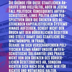 Die Gründe für diese staatlichen Angriffe sind vielfältig, aber in jedem Fall politisch: Konsequente antifaschistische, linke Politik kann Perspektiven über die Grenzen des bestehenden kapitalistischen Systems hinaus aufzeigen, scheut nicht den Bruch mit den bürgerlichen Gesetzen und stellt damit das staatliche Gewaltmonopol in Frage.