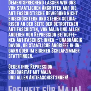 Gerade im sich verschärfenden politischen Klima hängt unsere antifaschistische Solidarität und Praxis nicht von den Grenzen des bürgerlichen Gesetzbuches ab, sondern richten sich nach dem, was wir für richtig und notwendig halten. Dementsprechend lassen wir uns von staatlichen Angriffen auf die antifaschistische Bewegung nicht einschüchtern und stehen solidarisch an der Seite der betroffenen Antifaschistin, von Maja und allen anderen von Repression betroffenen Antifaschist:innen – unabhängig davon, ob staatliche Angriffe in Ungarn oder im eigenen Schlafzimmer stattfinden.