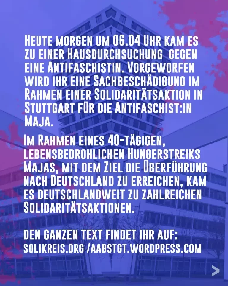 Heute [18.08.25] morgen um 06.04 Uhr kam es zu einer Hausdurchsuchung gegen eine Antifaschistin. Vorgeworfen wird ihr eine Sachbeschädigung im Rahmen einer Solidaritätsaktion in Stuttgart für die Antifaschist:in Maja.