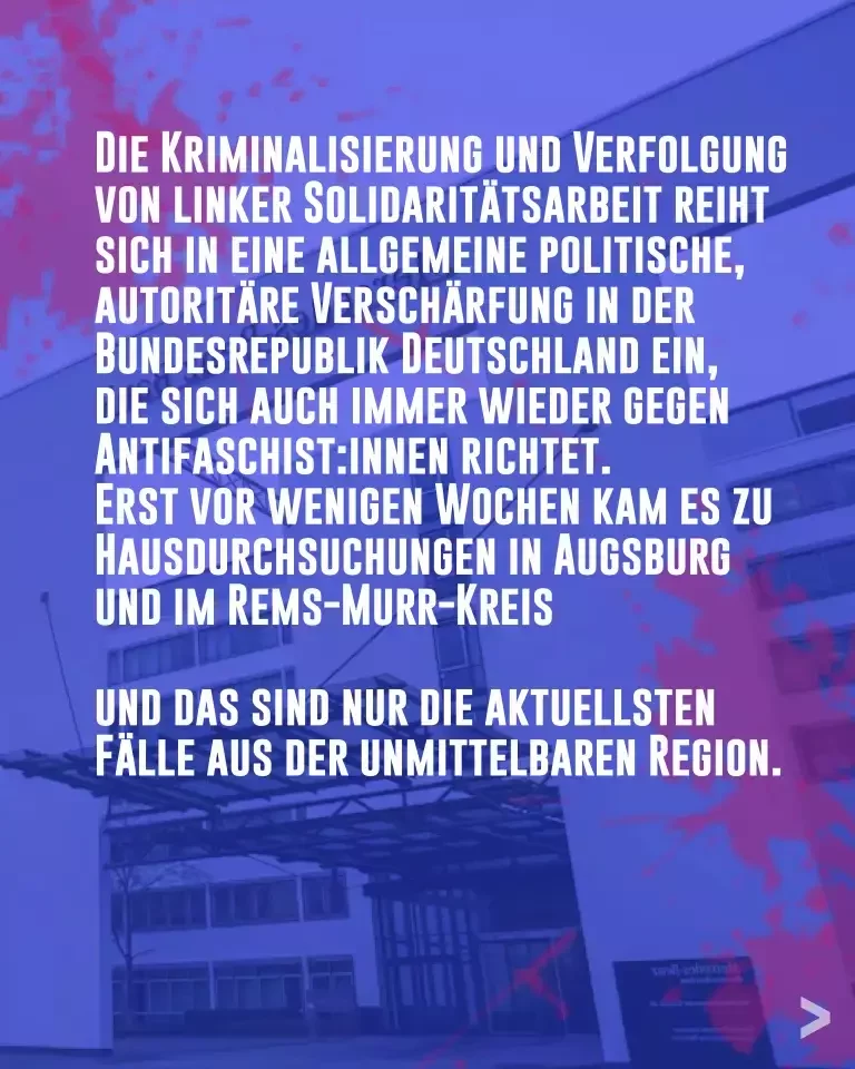 Die Kriminalisierung und Verfolgung von linker Solidaritätsarbeit reiht sich in eine allgemeine politische, autoritäre Verschärfung in der Bundesrepublik Deutschland ein, die sich auch immer wieder gegen Antifaschist:innen richtet. Erst vor wenigen Wochen kam es zu Hausdurchsuchungen in Augsburg (Vorwurf: Blockade gegen den IBler Martin Sellner) und im Rems-Murr-Kreis (Vorwurf: Angriff auf eine die „Die Heimat“-Kaderin) – und das sind nur die aktuellsten Fälle aus der unmittelbaren Region.