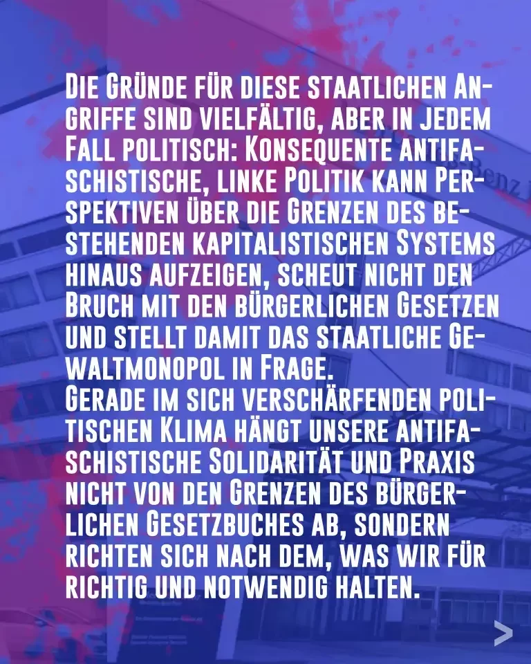 Die Gründe für diese staatlichen Angriffe sind vielfältig, aber in jedem Fall politisch: Konsequente antifaschistische, linke Politik kann Perspektiven über die Grenzen des bestehenden kapitalistischen Systems hinaus aufzeigen, scheut nicht den Bruch mit den bürgerlichen Gesetzen und stellt damit das staatliche Gewaltmonopol in Frage.