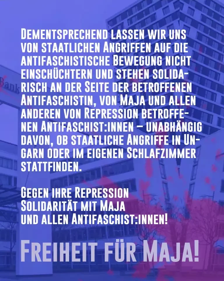 Maja ist eine Beschuldigte im sogenannten „Budapest-Komplex“, in dessen Rahmen Angriffe auf bekannte Neo-Nazis am sogenannten „Tag der Ehre“ 2023 in Budapest zur Last gelegt werden. Nach Majas Festnahme und Auslieferung durch den deutschen Staat sitzt Maja inzwischen seit über einem Jahr in Ungarn in Isolationshaft. Im Rahmen eines 40-tägigen, lebensbedrohlichen Hungerstreiks Majas, mit dem Ziel die Überführung nach Deutschland zu erreichen, kam es deutschlandweit zu zahlreichen Solidaritätsaktionen.