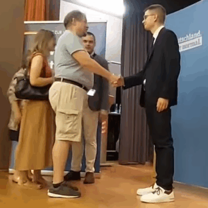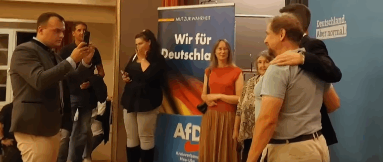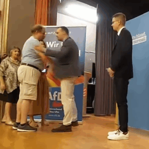 Freundschaftliche Umarmung mit Franz Schmid und ein sehr langer Handschlag mit Nikolas Lotz (30 Sekunden lang) – der ehemalige Ulmer AfD Gemeinderat Markus Mössle und verurteilter Neonazi-Bank- und Sexshopräuber war mit seiner Partnerin ebenfalls in der Weißenhorner Stadthalle.