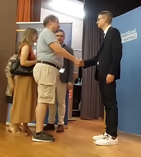 Freundschaftliche Umarmung mit Franz Schmid und ein sehr langer Handschlag mit Nikolas Lotz (30 Sekunden lang) – der ehemalige Ulmer AfD Gemeinderat Markus Mössle und verurteilter Neonazi-Bank- und Sexshopräuber war mit seiner Partnerin ebenfalls in der Weißenhorner Stadthalle.