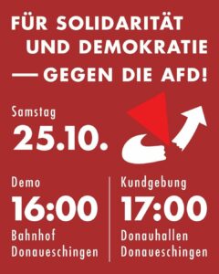 Am 25. Oktober will die AfD zum wiederholten Male in Donaueschingen ihren Wahlkampf einläuten. Das Motto der rechten Hetzer dieses Mal „Bürgerdialog“. Unter anderem mit der Parteivorsitzenden Weidel und dem Kandidaten für die kommenden Landtagswahlen Frohnmaier.