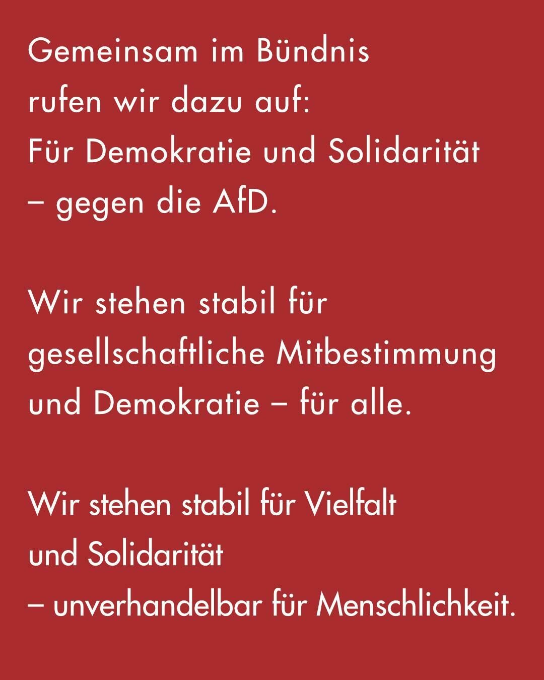 Gemeinsam im Bündnis mit Anderen rufen wir zu Protesten auf: Für Demokratie und Solidarität – Gegen die AfD! Für uns heißt das auch nicht zu schweigen über die Politik der Regierung: Demokratische Rechte wurden in den letzten Jahren massiv eingeschränkt, Gesetze werden verschärft und es findet eine militärische Aufrüstung statt, nach innen und nach außen, wie sie es Jahrzehnte nicht mehr gab.