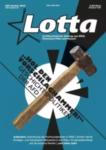 LOTTA ist eine antifaschistische Zeitung mit Fokus auf NRW, Rheinland-Pfalz und Hessen. Auf der Seite findet ihr regelmäßig Recherchen, Analysen und Einschätzungen; die vollständige, gedruckte Ausgabe erscheint vier Mal im Jahr. Der oben zitierte Artikel ist aus der aktuellen Ausgabe #99 (siehe links) – einige weitere Beiträge aus dieser findet ihr hier online.